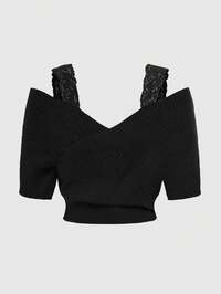 Kawaii Camiseta de punto con escote en V y manga corta con encaje gótico, blusa de punto con cuello cruzado en negro para mujer, top de punto de talla grande