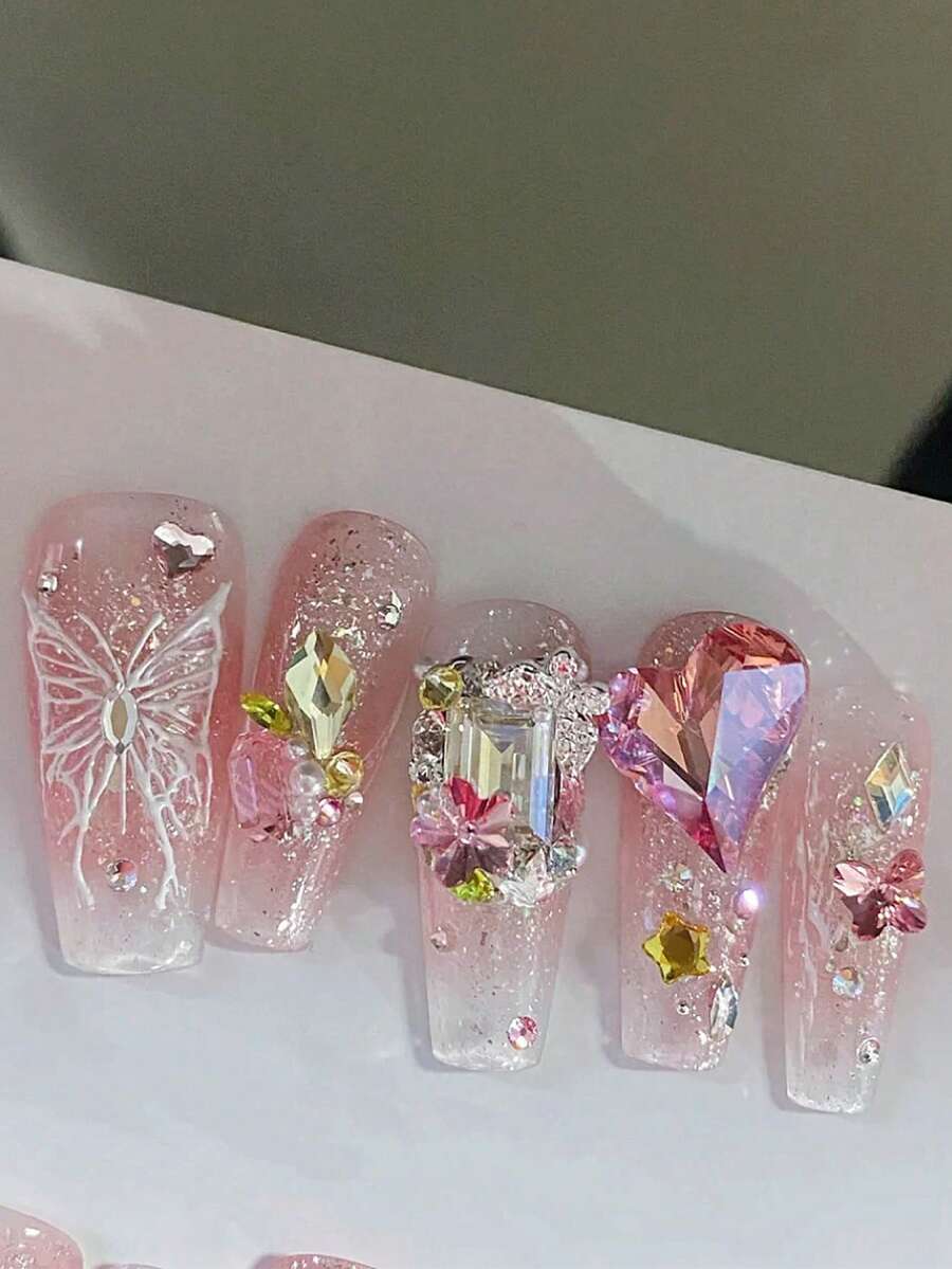 (en Stock) 10 Piezas / Set De Uñas Postizas Largas Con Patrón Floral Y De Gafas De Sol Para El Verano Con Pegamento De Gelatina