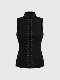 Grunge Punk Top sin mangas sexy de mujer con tirantes finos, escote bajo, en color negro, con tachuelas, rhinestones y cintas, adecuado para verano, playa, graduación, Pascua, conciertos, vacaciones en Nashville, festivales de música, rock