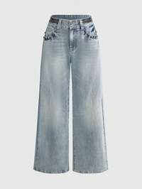 ROMWE Avant Jeans anchos y sueltos de uso diario y casual con bordado de caracteres japoneses para mujeres