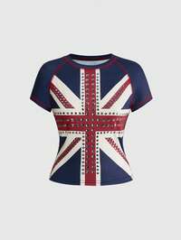 Camiseta de mujer con estampado de bandera británica, remaches de diamante de imitación y estilo retro Y2K streetwear