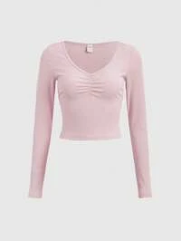 Camiseta casual de mujer de manga larga, cuello redondo y ajuste ceñido en un solo color