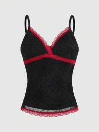 Grunge Punk Atractivo Top De Tirantes Con Encaje Y Malla De Color Negro Y Rojo Con Contraste De Color