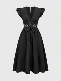 Grunge Punk Vestido mini corto y sexy de color negro con cuello en V profundo, sin mangas y espalda descubierta, con aplicaciones de tachuelas, cristales y cintas, ideal para verano, playa, graduación, Pascua, conciertos, viajes a Nashville, festivales de música y rock