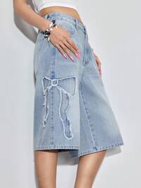 Shorts vaqueros casuales con dobladillo deshilachado y lazo, azul claro