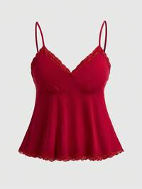 Kawaii Blusa de talla grande para mujer con ribete de encaje, pespunte de espina de pescado, tirantes finos, decoración de lazo, sin mangas, para el Día de San Valentín