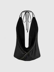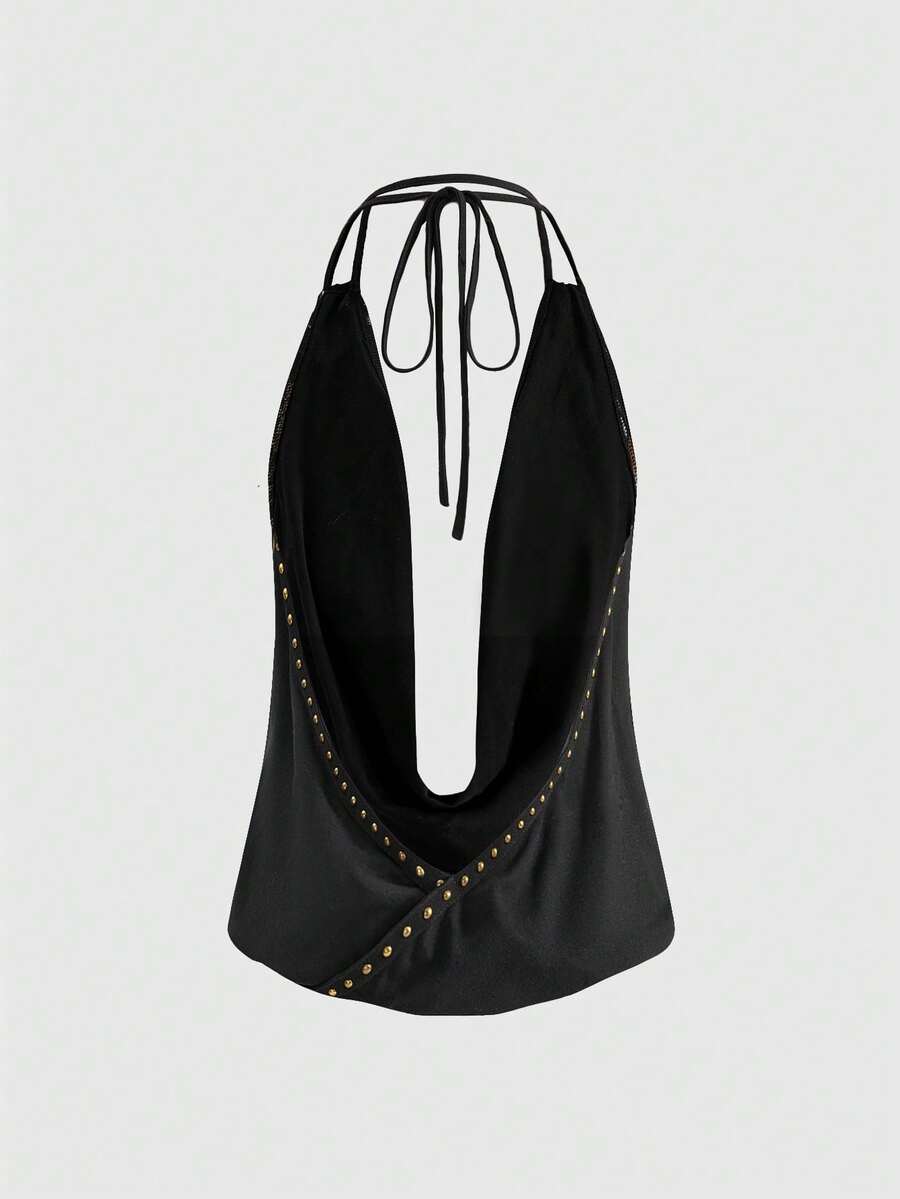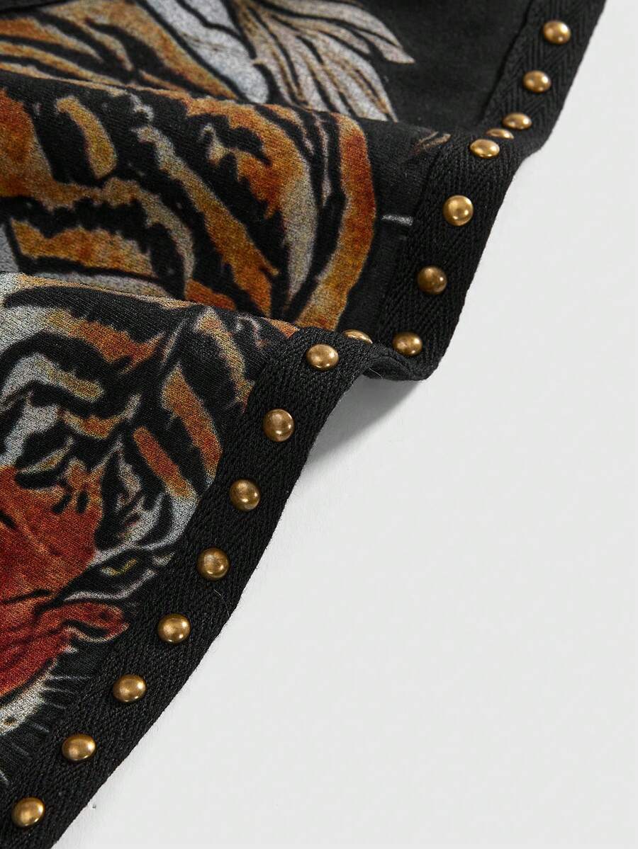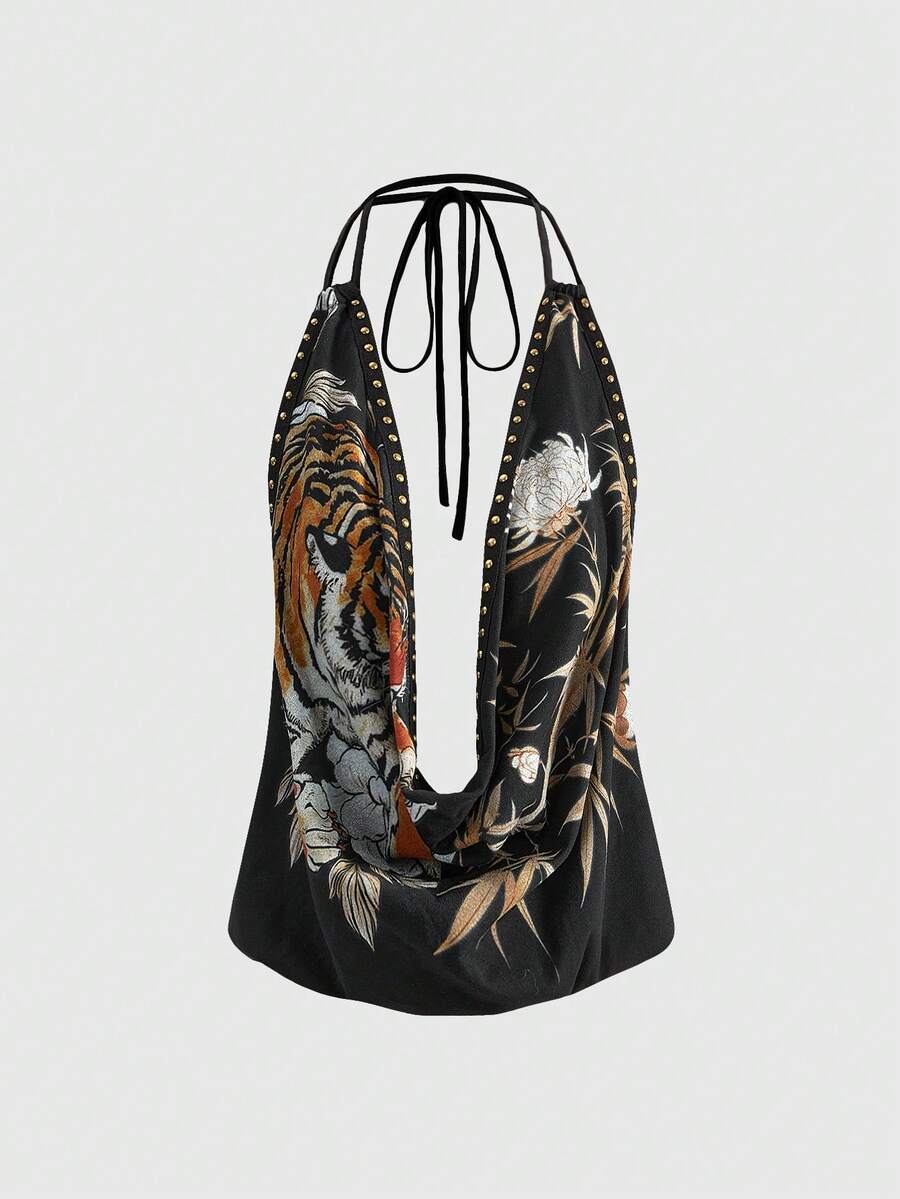 Top de tirantes para mujer con cuello profundo drapeado, estampado retro de tigre, flores y geisha, con remaches y cristales, en estilo vintage Y2K