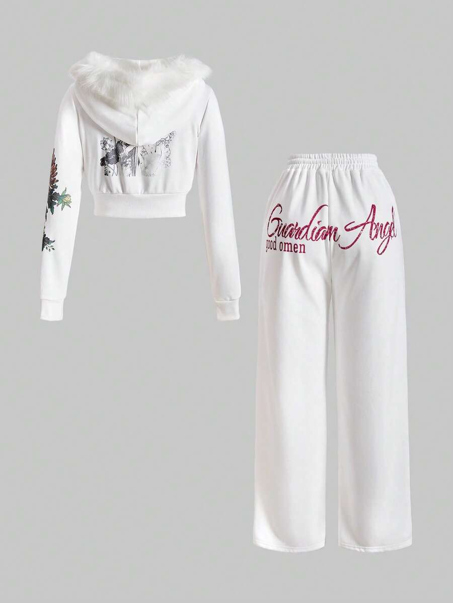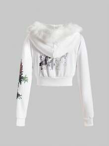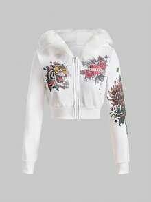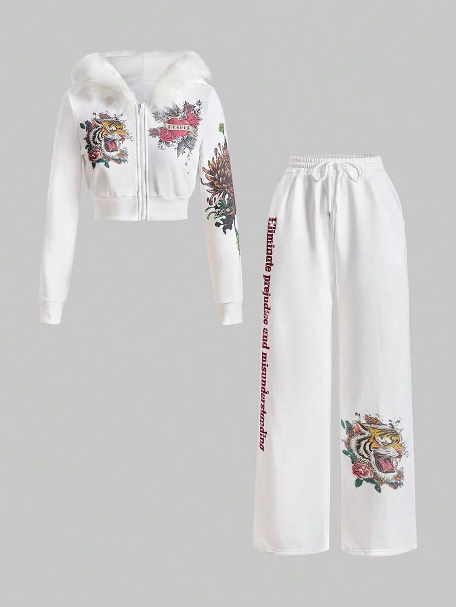 Grunge Punk Set de 2 piezas con cuello profundo drapeado, estampado de flores y cabeza de tigre con rhinestones en estilo retro Y2K para mujeres