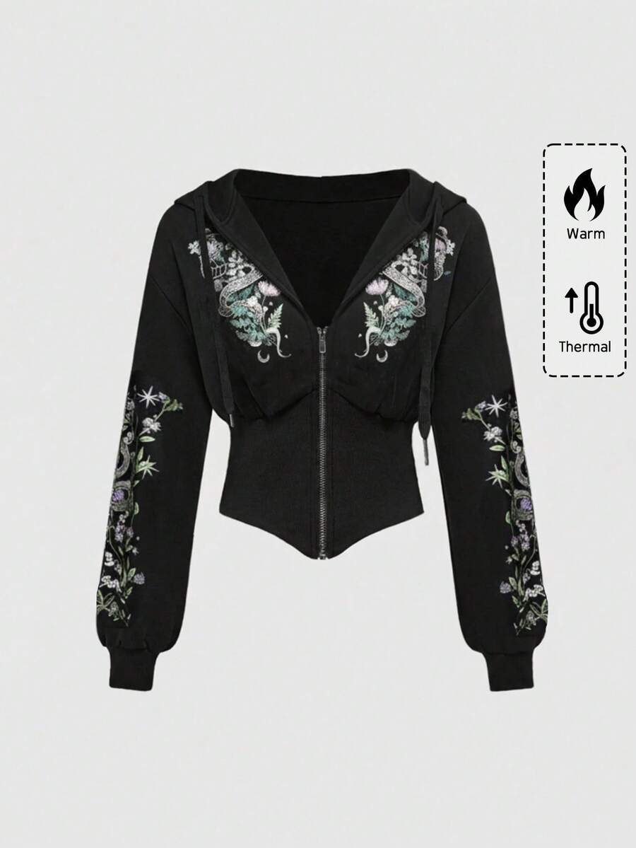 EDITION Sudadera con capucha de talle alto de talla grande con estampado de flor de serpiente de selva espinosa de luna oscura gótica en color morado, sudadera de talle alto con capucha de talla grande para otoño/invierno, parte superior de exteriores de talla grande para mujer en otoño/invierno