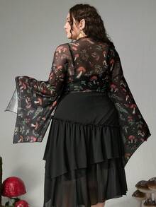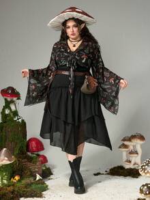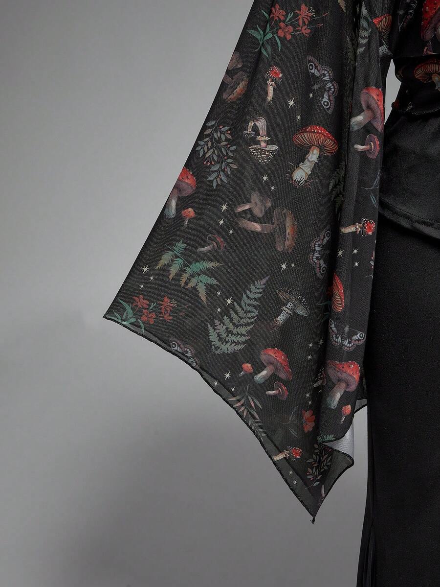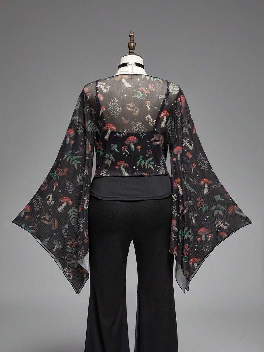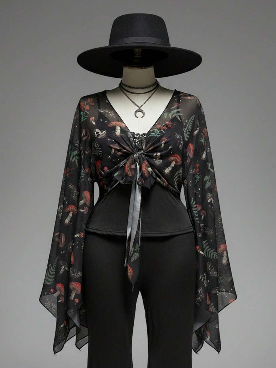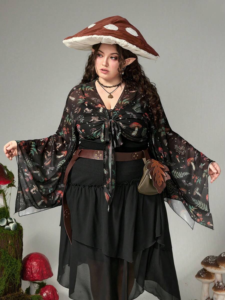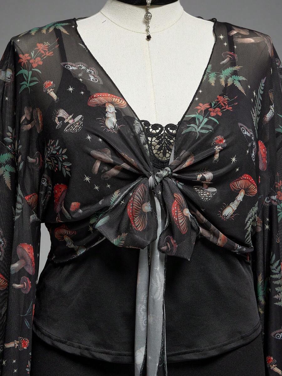 Fairycore Blusa de manga acampanada con estampado vintage de setas, flores y malla con nudo delantero para mujer talla grande