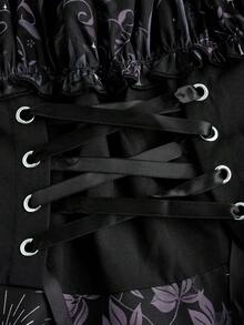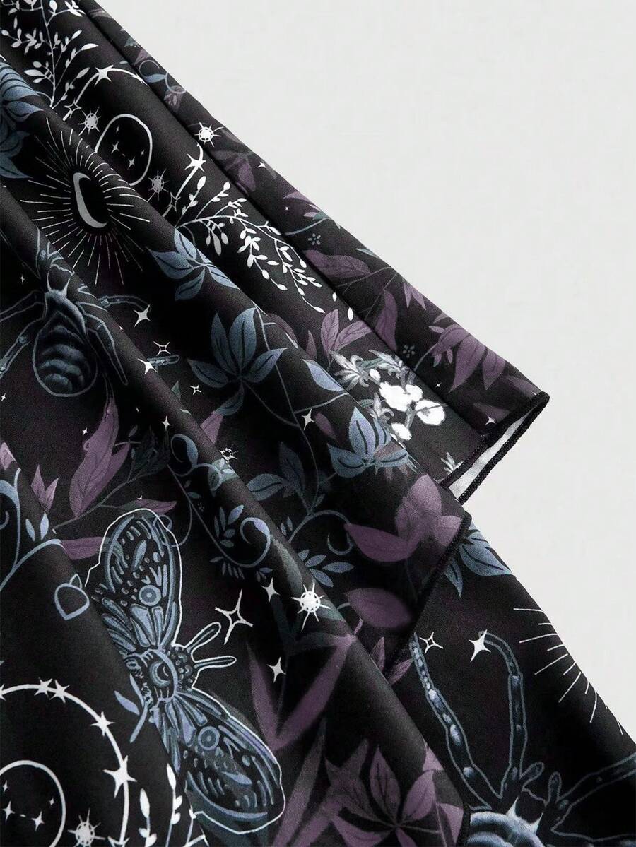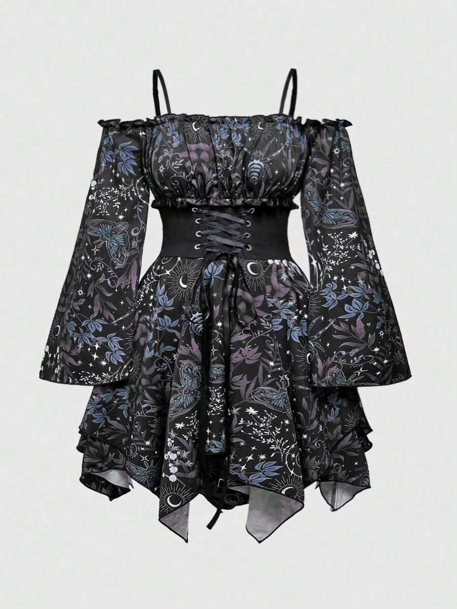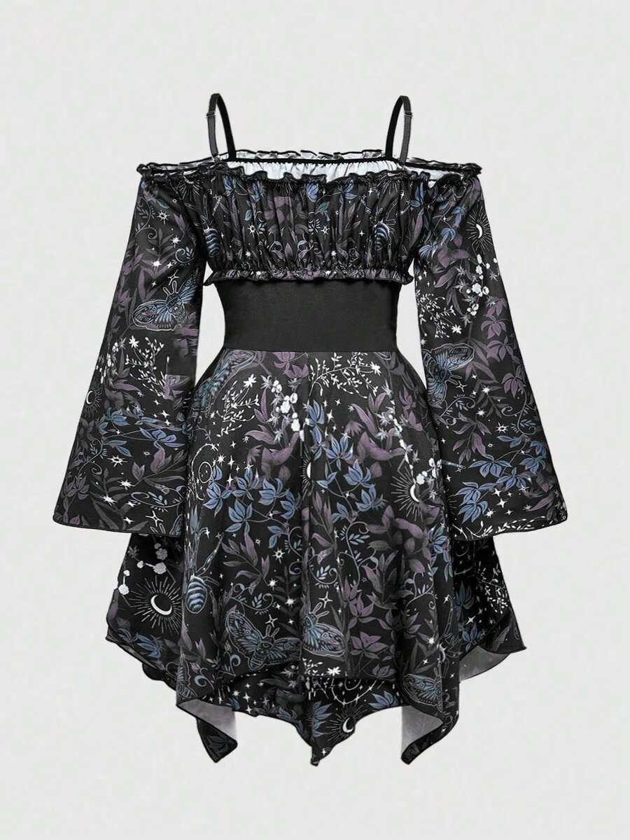 Goth Vestido asimétrico con hombros descubiertos, mangas acampanadas, estampado todo sobre de sol, luna, estrella, insecto y flores, y cinturón en la cintura para tallas grandes