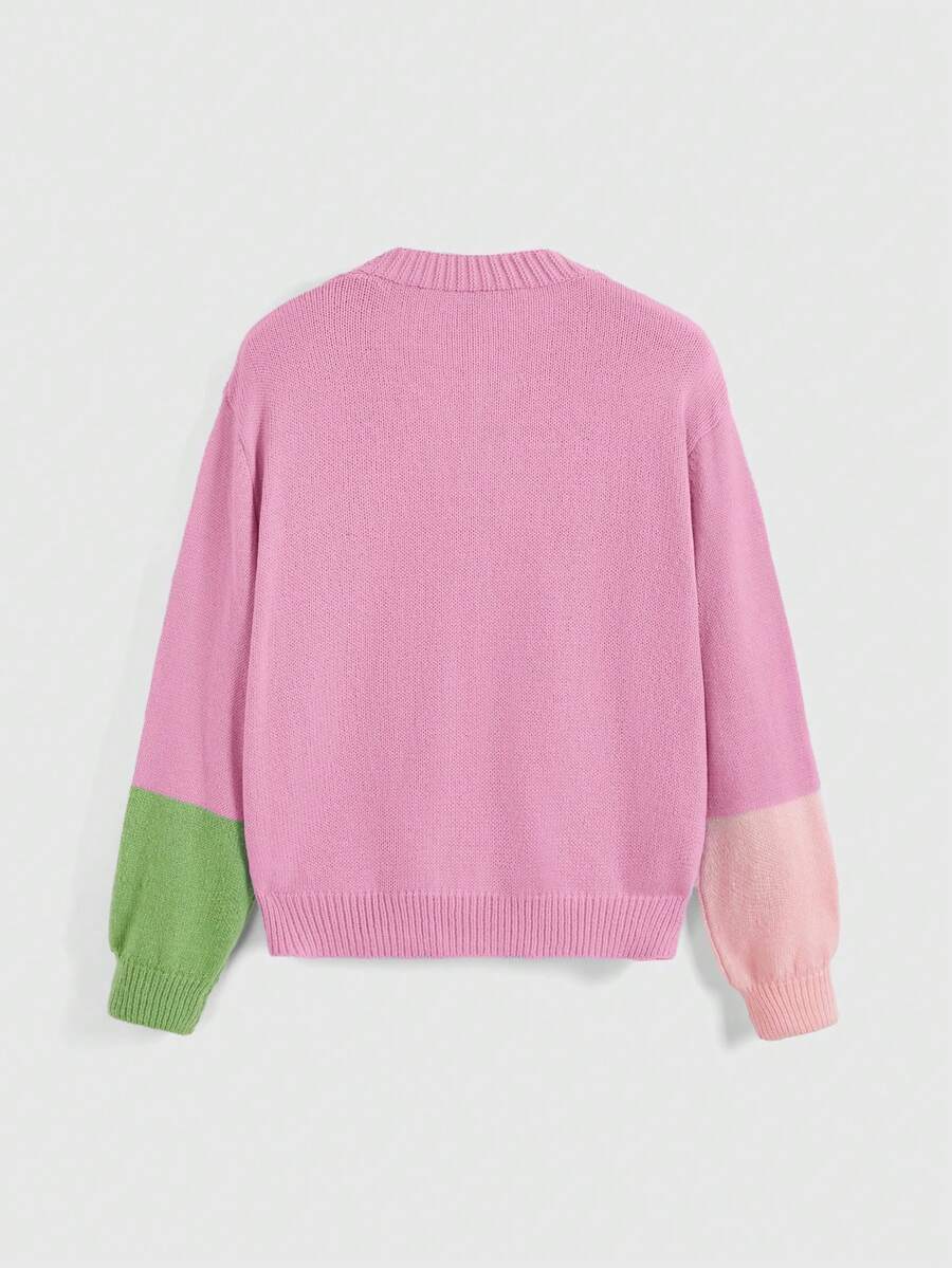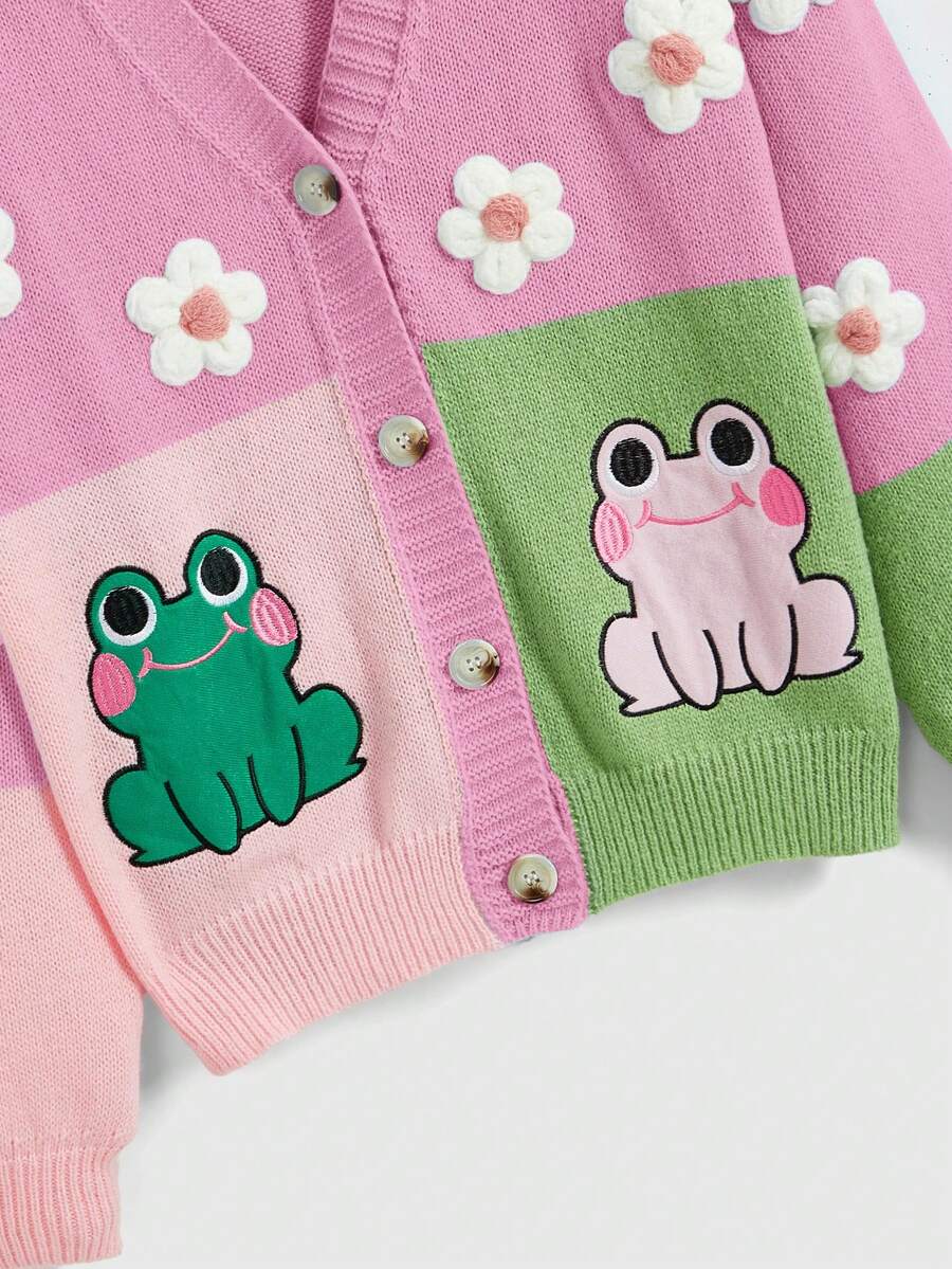 Kawaii Cárdigan de talla grande con bordado de rana linda y aplicación de flores en bloque de color