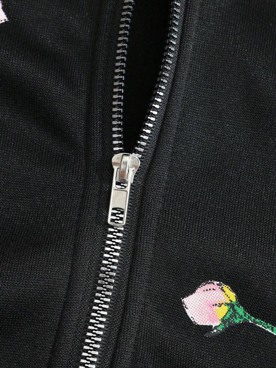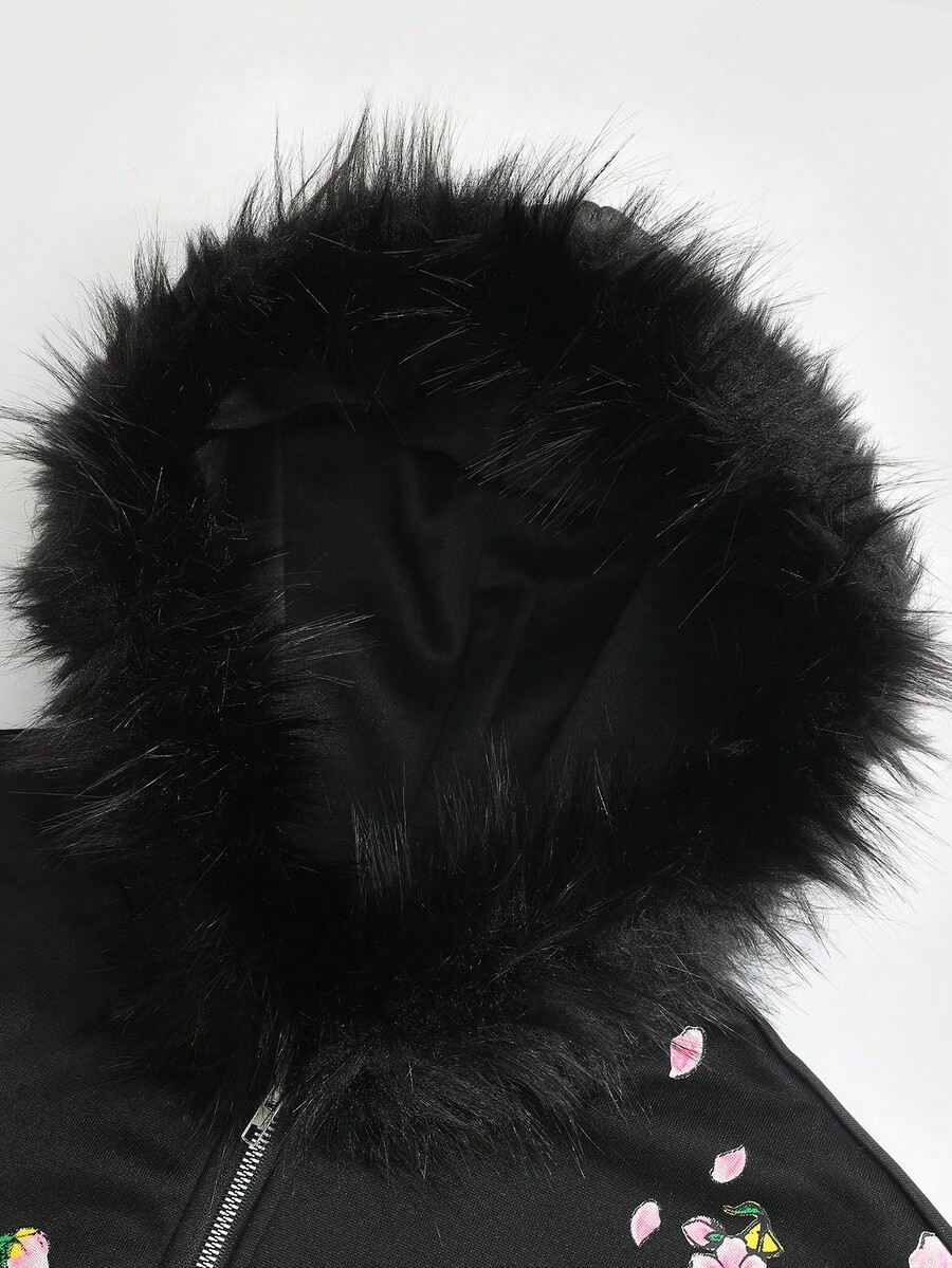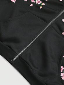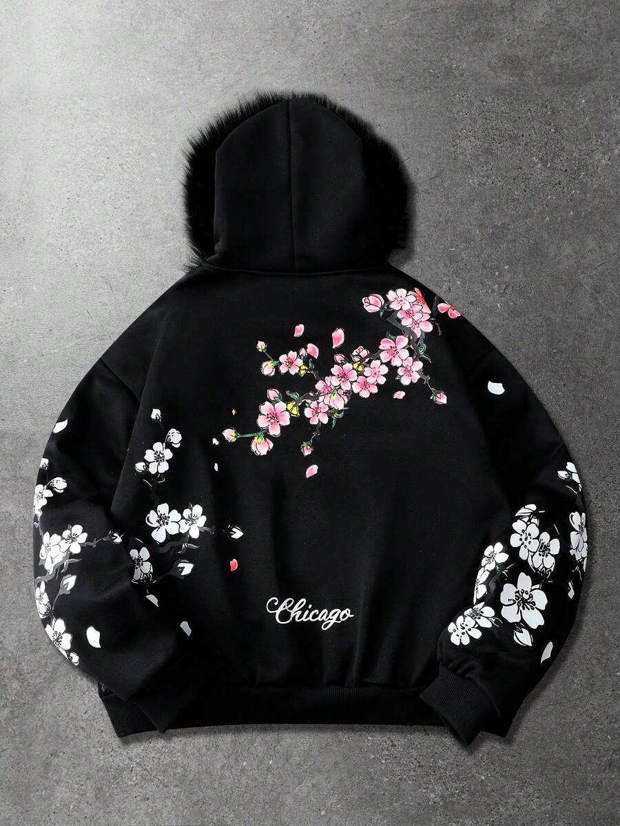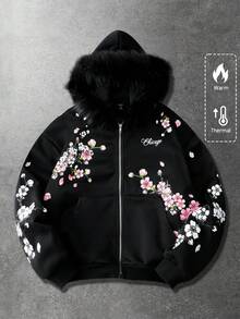 Sudadera gruesa de estilo urbano para hombre, con estampado de flores de cerezo y texto en inglés, cuello de piel, para otoño/invierno
