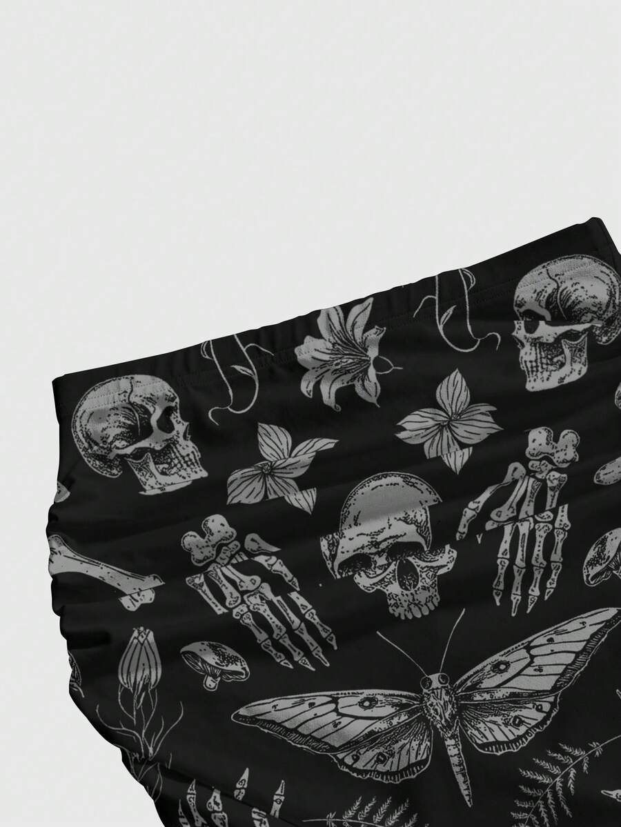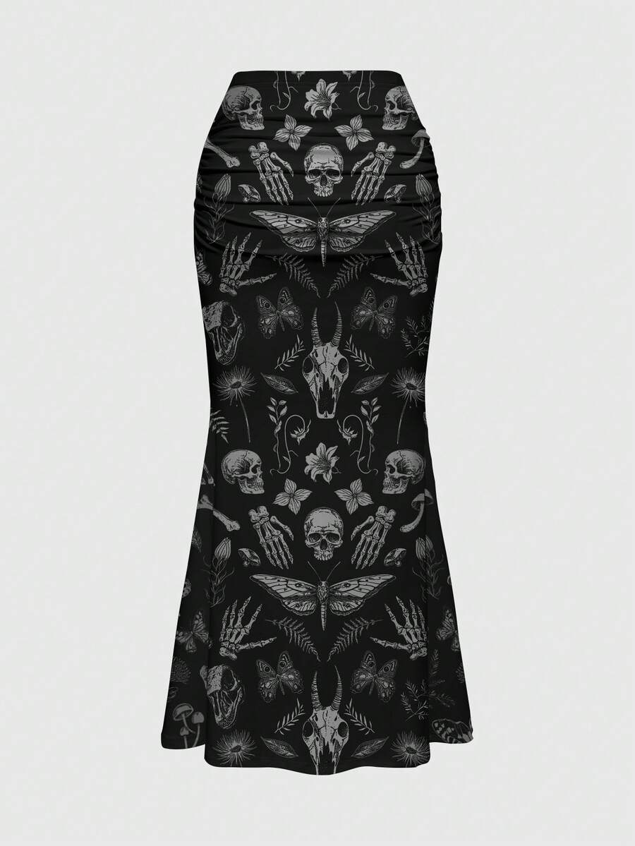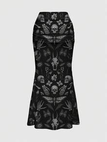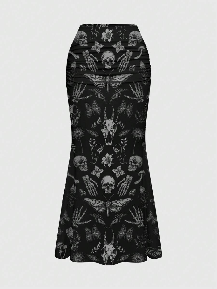 Goth Falda ajustada con volantes y bajo de sirena con estampado todo sobre estilo gótico, oscuro y misterioso con motivos de bosque, plantas, flores, calavera, polilla, mariposa, seta, sol, luna, estrella y hoja para mujeres
