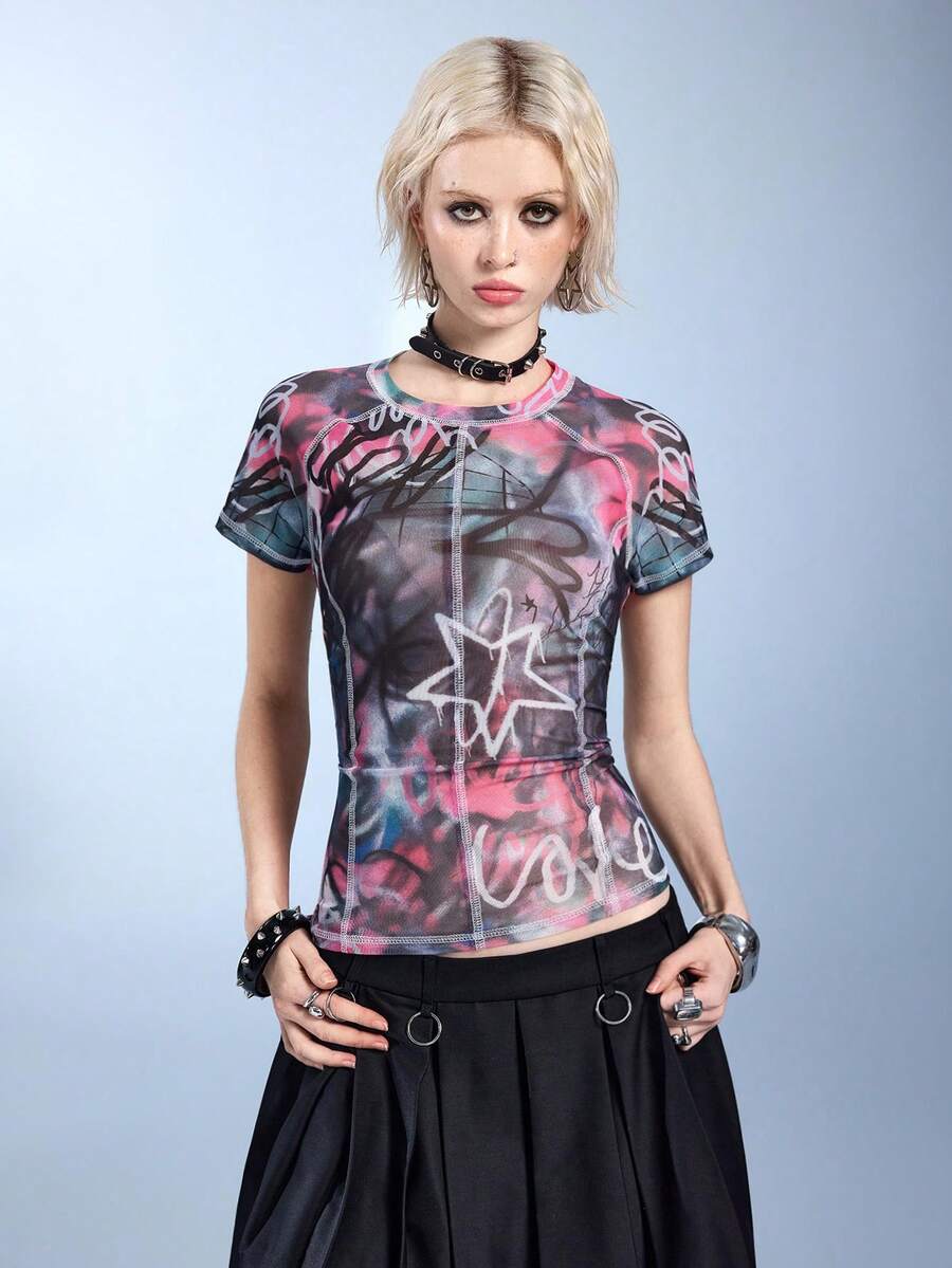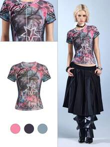ROMWE Avant Camiseta de manga corta con estampado integral de flor de lirio, eslogan y graffiti de vanguardia, retro y rebelde para mujer