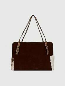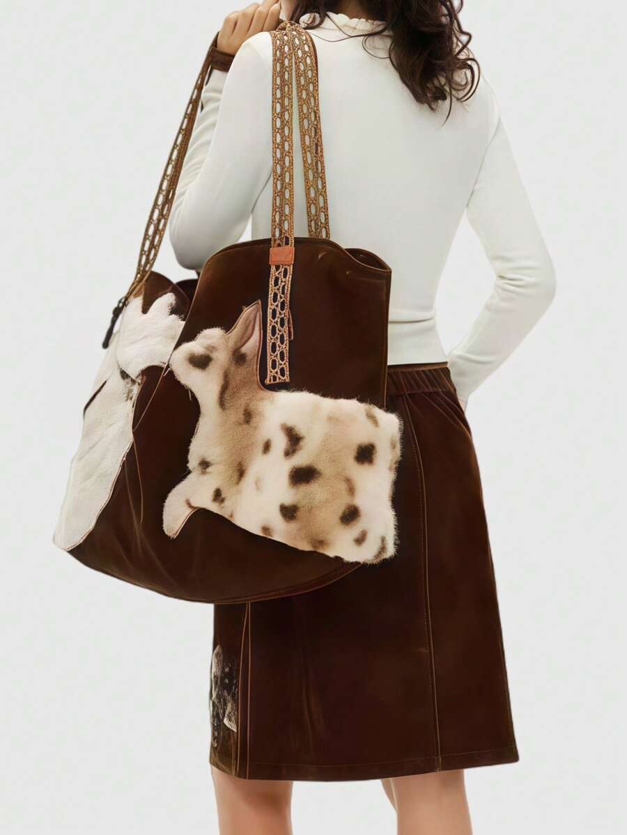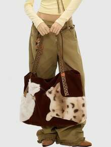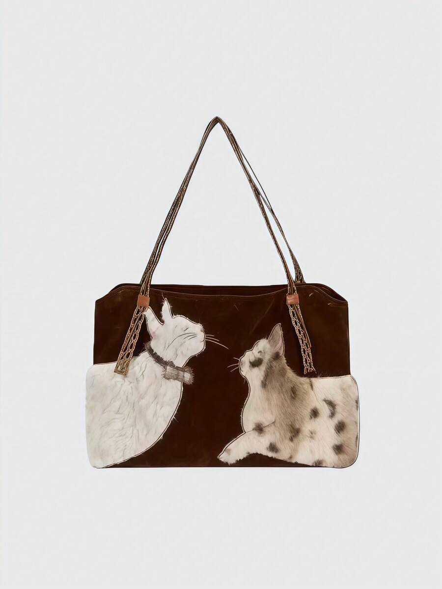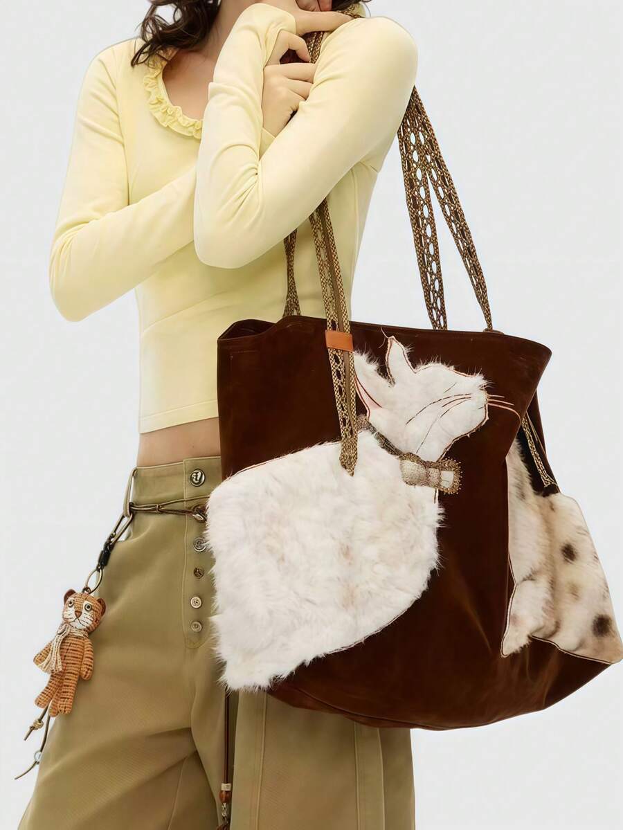 Fairycore 1 pieza Bolso de tela grande de estilo vintage con bordado de gato "Millennium Babe" en color marrón, con correa tejida de gran capacidad y multiusos, de estilo minimalista y salvaje, adecuado para ir al trabajo, la escuela, viajar, fiestas y compras