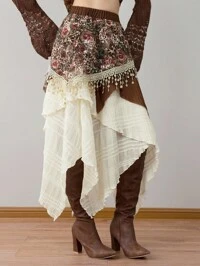 ROMWE Avant Falda midi asimétrica de mujer con parches de encaje floral en estilo vintage Mori Kei y Cottagecore