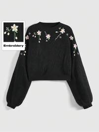 Fairycore Suéter corto de punto casual bordado de manga de farol para primavera y otoño