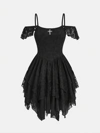 Goth Vestido camisero con hombros descubiertos, encaje de contraste, estampado de iglesia y bajo asimétrico, estilo gótico